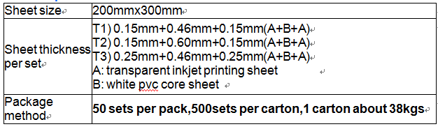 2.Parameters for 200X300mm Non-laminating inkjet PVC sheet (Dragon card sheet) for ID Card Production,plastic card material